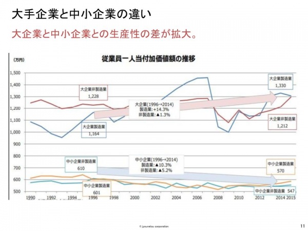 生産性において、中小企業は大企業に比べ2倍近くの差をつけられています。ここを上げていくことが組織拡大をしていく上で非常に重要です。